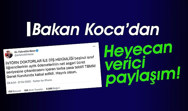 Bakan Koca paylaşımında, "İntörn doktorlar ve diş hekimliği beşinci sınıf öğrencilerinin aylık ödemelerinin net asgari ücret seviyesine çıkarılmasını içeren torba yasa teklifi TBMM Genel Kurulu'nda kabul edildi." dedi.