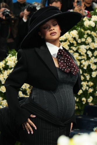 çiçek desenli Marc Jacobs tasarımı bir elbiseyle duyurdu. Geniş kenarlı şapkası ve polka dot kravatıyla tamamlanan bu görünüm, hem etkinliğin “Superfine: Tailoring Black Style” temasına uyum sağladı hem de Rihanna’nın hamileliğini öne çıkardı.