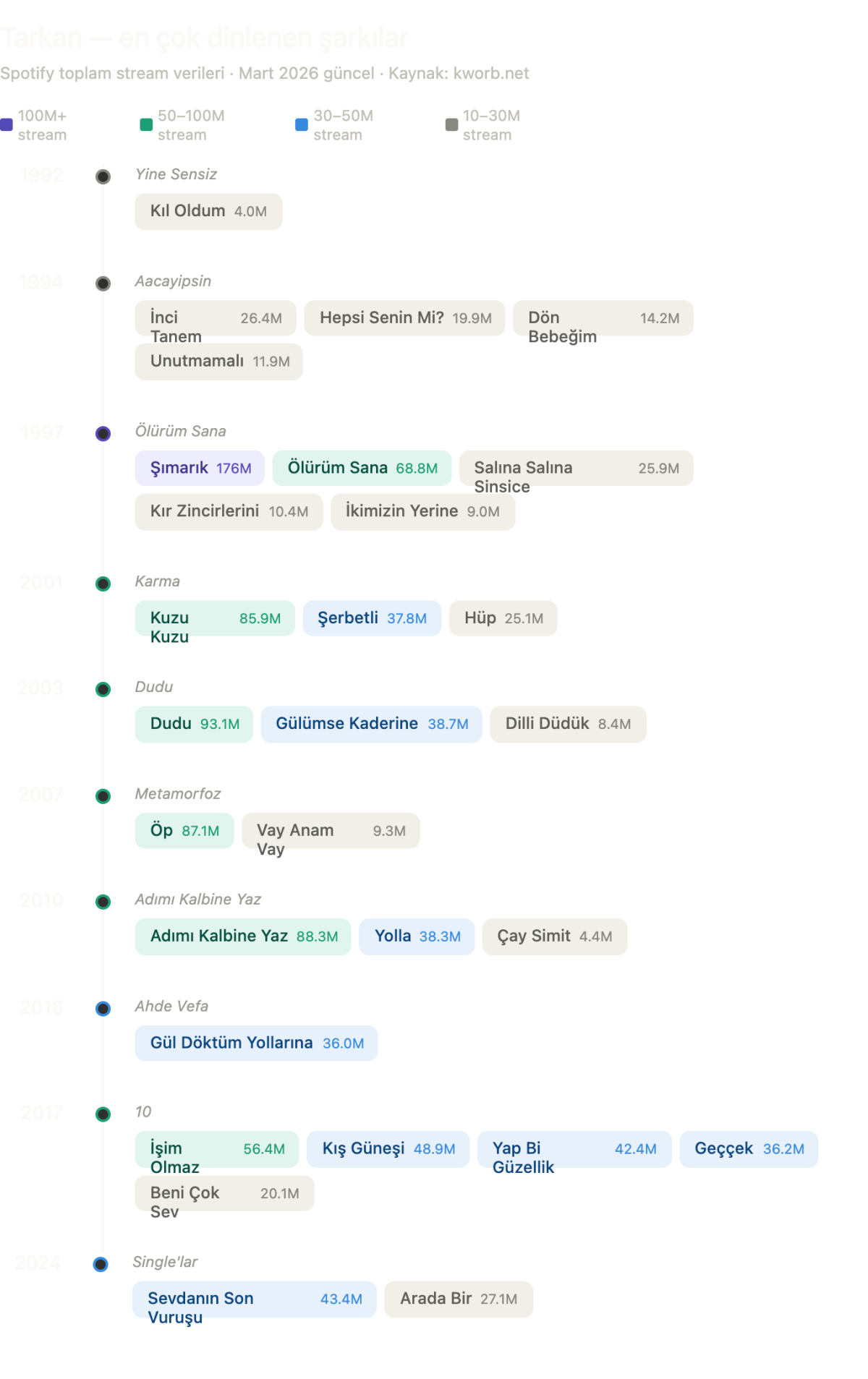 İşte Tarkan'ın 1992'den günümüze en çok dinlenen şarkılarının zamansal infografiği! Birkaç dikkat çeken nokta: