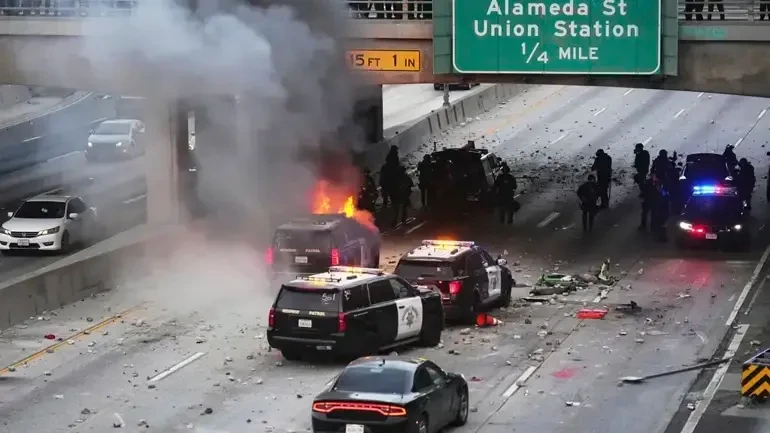 Protestoların üçüncü gününde, göstericiler 101 Otoyolu’nu kapatarak trafiği felç etti. Arcadia Caddesi’nde beş Waymo sürücüsüz aracı ateşe verildi; araçların lastikleri kesildi, camları kırıldı ve üzerine anti-ICE mesajları yazıldı. Elektrikli araçların bataryaları nedeniyle yangınlar söndürülemedi, bu da kaosu artırdı. LAPD, otoyoldaki protestocuları dağıtmak için göz yaşartıcı gaz, plastik mermiler ve flaş bombaları kullandı. California Otoyol Devriyesi, akşam saatlerinde otoyolu yeniden açtı, ancak 17 kişi gözaltına alındı.
